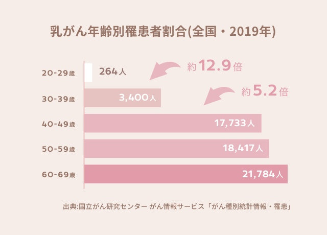 乳がんの罹患者数は年齢とともに急激に増加していきます。また30代の罹患者数も他部位のがんに比べて多い傾向にあります。