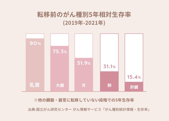 他の部位に転移する前の段階で乳がんの5年生存率は90%。他のがんと比較してもより早期発見が重要な病気です。