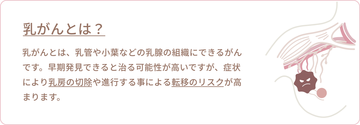 乳がんとは、乳管や小葉などの乳腺の組織にできるがんです。早期発見できると治る可能性が高いですが、症状により乳房の切除や進行する事による転移のリスクが高まります。